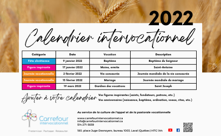 N'oubliez pas d'ajouter vos propres figures inspirantes (fondateurs, patrons, etc.) et vos anniversaires (naissance, ordination, voeux, etc.) afin de livrer un témoignage vraiment personnel de votre vocation.
